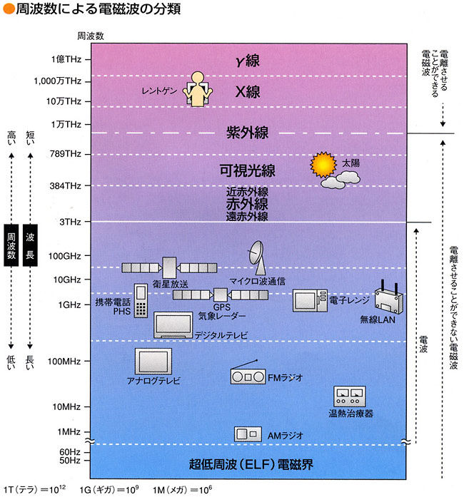 1k=1000Hz 10の3乗ヘルツ 1M=1000kHz 10の6乗ヘルツ 1G=1000MHz 10の9乗ヘルツ 1T=1000GHz 10の12乗ヘルウツ 分かりやすく書くと 1キロ・ヘルツは1秒間に1,000回、千回も電気が変化する 1メガ・ヘルツは1秒間に1,000,000回 、すなわち100万回〃 1ギガ・ヘルツは1秒間に1,000,000,000回 、すなわち10億回〃 1テラ・ヘルツは1秒間に1,000,000,000,000回、すなわち 1兆回〃 赤外線でもうT(テラ)の回数に突入。 1秒に1兆回以上、電気の波が変化しているわけだ。 1cm平方メートルの、100万分の100万分の100万分のさらに10分の1の大きさの分子を、1秒間に1兆回以上の電気の波が襲う。細胞レベルでの衝撃とはいかに???